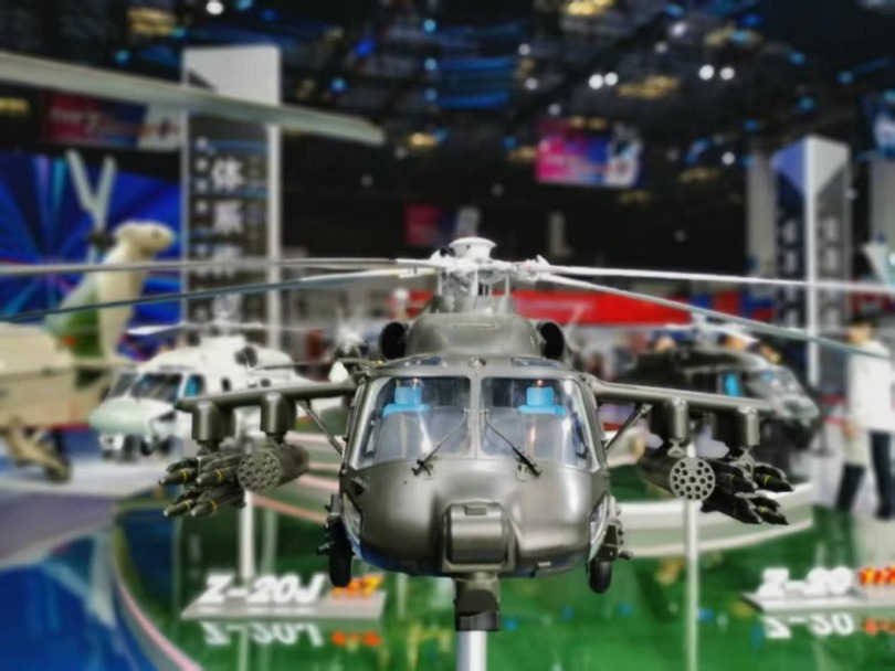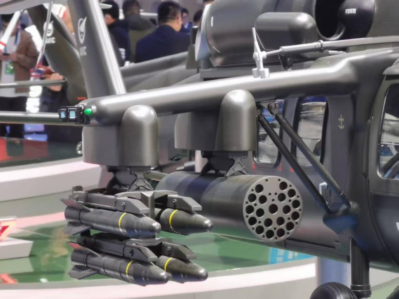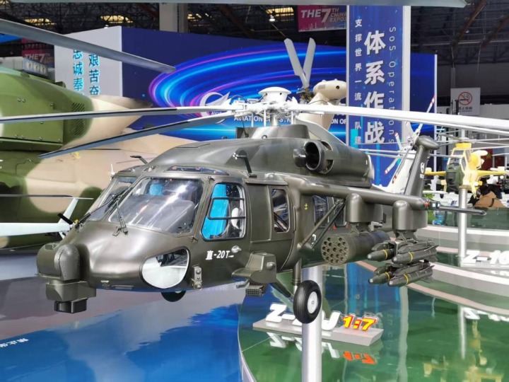 在室内静态战区,中国航空工业集团展示了直-20T直升机的模型,从模型可以看出,直-20T直升机短翼配备了4个挂点,可挂载空地导弹、火箭发射巢等武器,结合复合挂架其可携带8枚空地导弹和2个容纳了19根发射管的火箭发射巢,外挂武器携带量堪比一同展出的直-10ME或直-19E两款专用的武装直升机,火力凶猛。