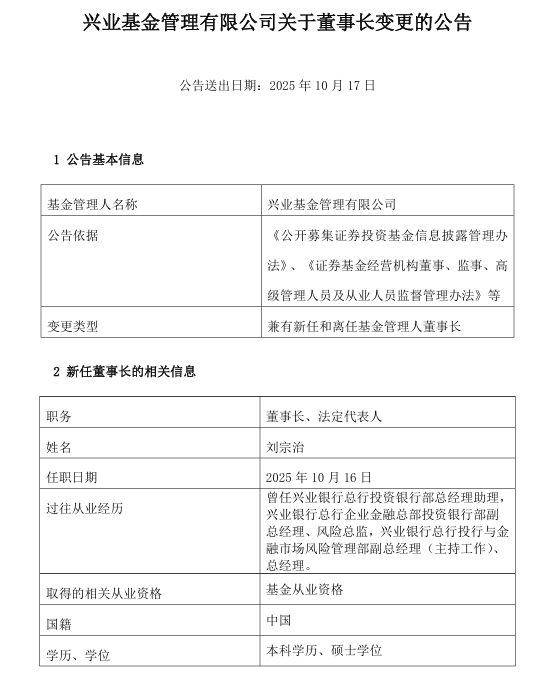 10月17日,兴业基金发布董事长变更公告。公告显示,公司任命刘宗治为新董事长,原董事长叶文煌因年龄原因离任,任职日期和离任日期均为2025年10月16日。