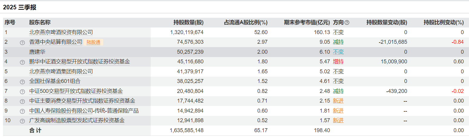 同日,燕京啤酒发布关于2025年前三季度利润分配预案的公告。公告提到,公司2025年前三季度利润分配采取派发现金股利的方式,以固定比例的方式分配。分配预案为:以2025年9月30日总股本28.19亿股为基数,每10股派现金股利1.00元(含税),不送红股,不以资本公积金转增股本。公司拟共分配现金股利2.82亿元。