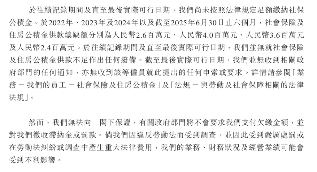2022年、2023年及2024年以及截至2025年上半年,社会保险及住房公积金供款总缺额分别为260万元、400万元、360万元及240万元。于往绩记录期间及直至最后实际可行日期,公司并无就社会保险及住房公积金供款不足作出任何拨备。