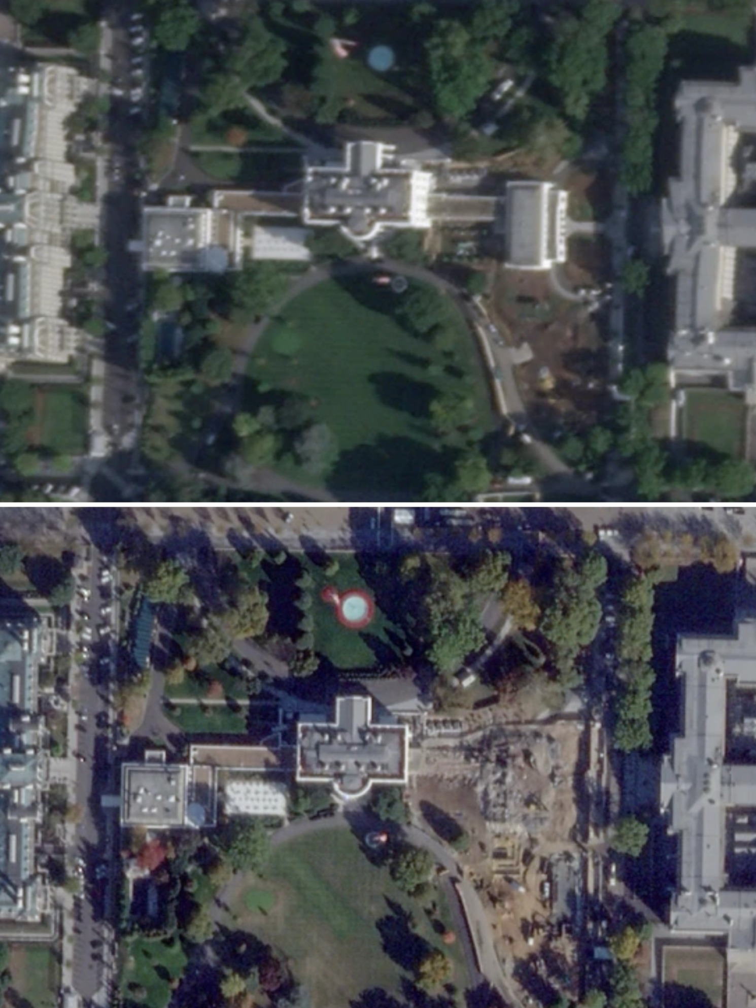美国白宫9月26日(上)与10月23日(下)的卫星照片对比。图片来源:央视新闻