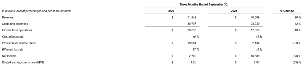 当地时间10月29日,Meta公布了截至2025年9月30日的2025财年第三财季业绩,公司第三财季营收512.42亿美元,较去年同期增长26%,高于市场预期的494亿美元;净利润同比大降83%至27.09亿美元;摊薄后每股收益1.05美元,远低于市场预期的6.70美元。