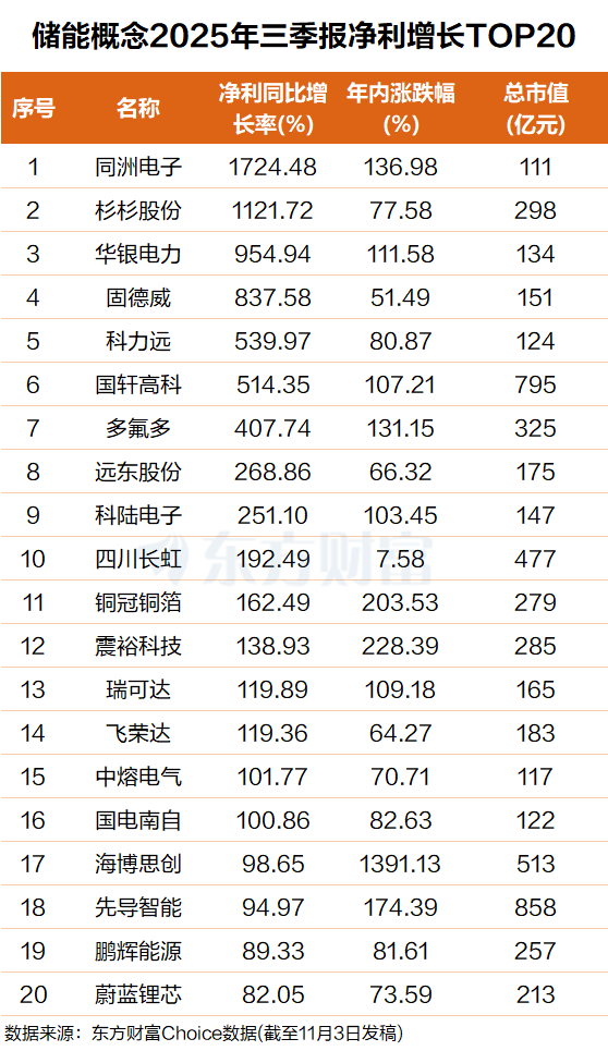 东方财富Choice数据显示,截至11月3日收盘,总市值超100亿的储能概念中,多只个股2025年三季报净利润高增长,其中同洲电子排名第一,三季报净利润增长超17倍,年内至今涨幅超130%;杉杉股份排名第二,三季报净利润增长超11倍,年内至今涨幅超77%。