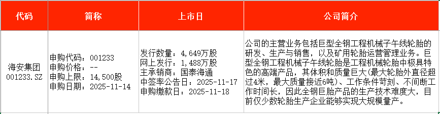 从时间表看,南特科技(920124)将在本周二(11月11日)申购;海安集团(001233)将在本周五(11月14日)申购。