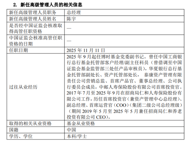 11月11日晚,博时基金发布高管变更公告,陈宇自11月11日起正式接任公司总经理一职。