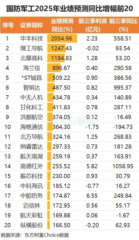 展望2025年全年,从机构预测角度来看,华丰科技2025年预测净利润同比增长为2054.96%,排在国防军工板块首位。理工导航紧随其后,2025年预测净利润同比增长1247.43%。北摩高科排在第三,2025年业绩预测同比为1184.83%。