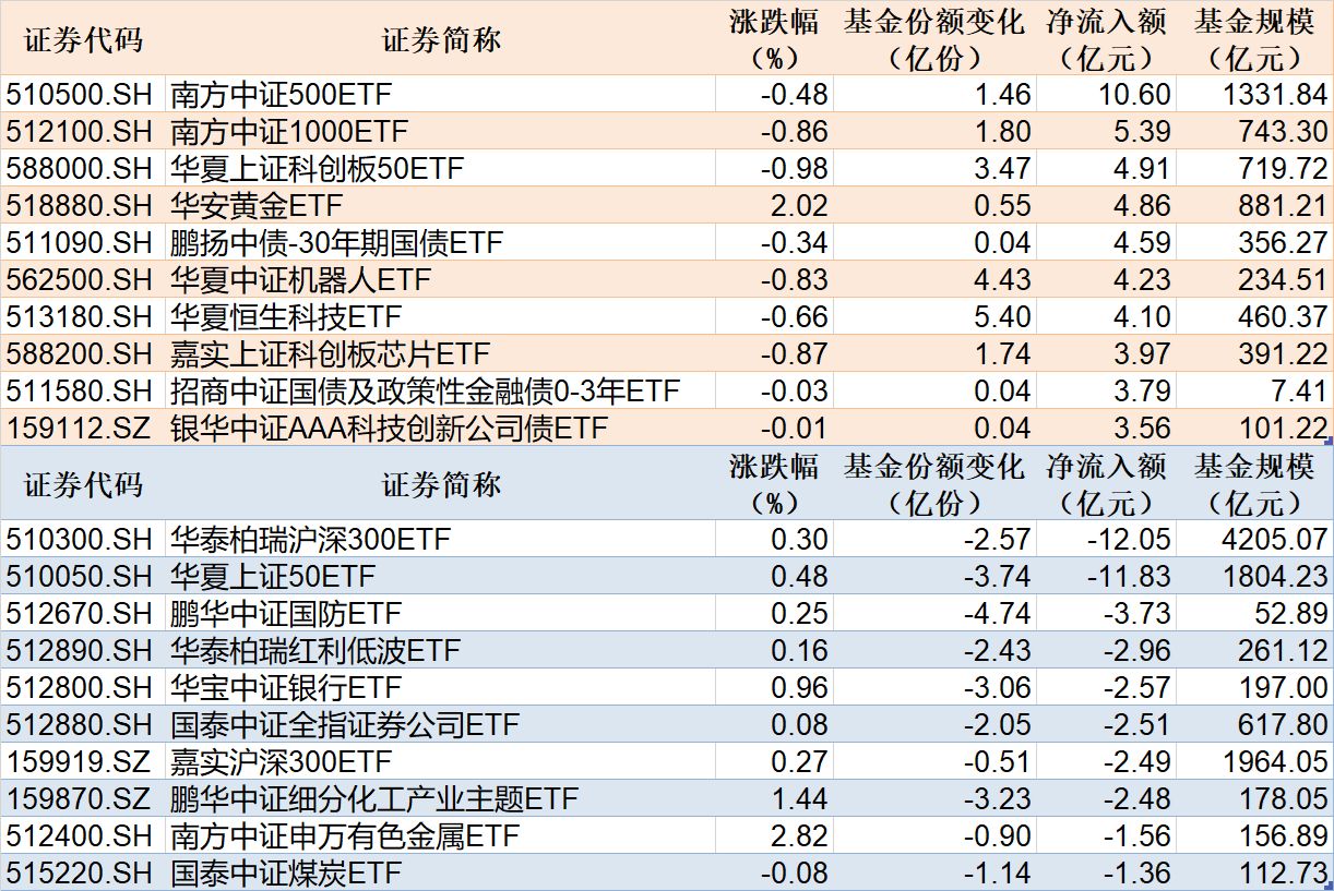 与此同时,华泰柏瑞沪深300ETF基金份额减少 2.57 亿份,对应资金净流出 12.05 亿元;华夏上证50ETF份额减少 3.74 亿份,出现净流出 11.83 亿元;鹏华中证国防ETF份额减少 4.74 亿份,录得净流出 3.73 亿元。