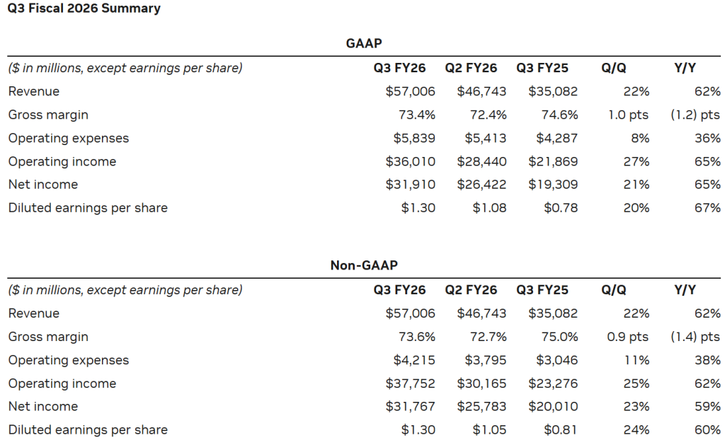 当地时间11月19日美股盘后,英伟达(Nasdaq:NVDA)发布了截至10月26日的2026财年第三财季财报,期内实现营收570.06亿美元,同比上涨62%,高于市场预期的542亿美元;美国通用会计准则(GAAP)下净利润319.10亿美元,同比上涨65%;Non-GAAP下每股摊薄收益为1.30美元,同比上涨60%,超出市场预期的1.25美元。