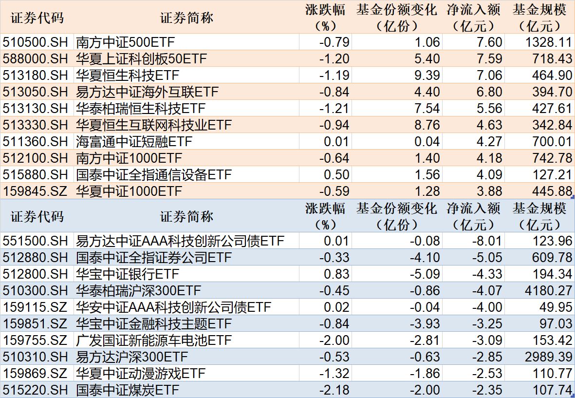 与此同时,易方达中证AAA科技创新公司债ETF基金份额减少 0.08 亿份,对应资金净流出 8.01 亿元;国泰中证全指证券公司ETF份额减少 4.10 亿份,出现净流出 5.05 亿元;华宝中证银行ETF份额减少 5.09 亿份,录得净流出 4.33 亿元。