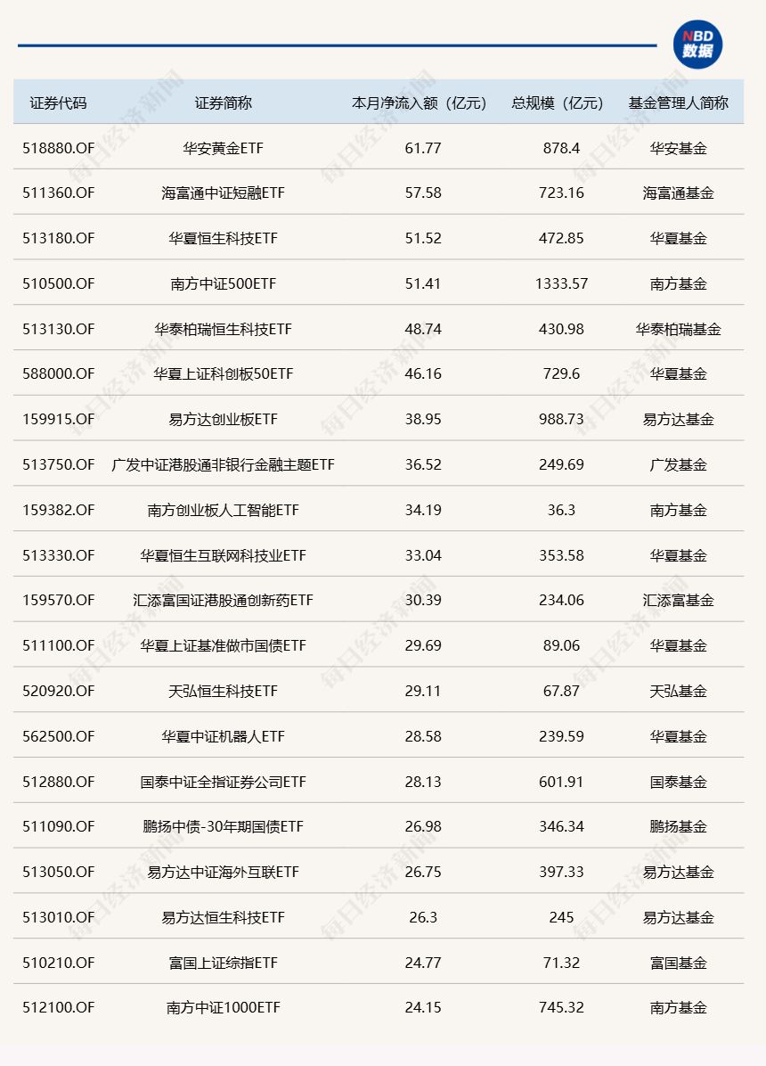 截至11月21日,本月资金净流入额居前20的ETF名单如下: