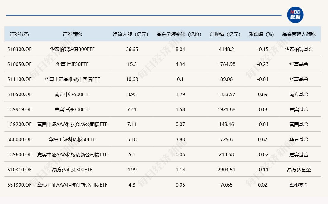 Wind数据显示,在11月21日的非货币ETF市场中,华泰柏瑞沪深300ETF基金份额增加8.04亿份,对应资金净流入36.65亿元(前一交易日净流入额为38.76亿元);华夏上证50ETF基金份额增加4.94亿份,实现净流入15.3亿元;华夏上证基准做市国债ETF份额增加0.1亿份,带来净流入10.68亿元。