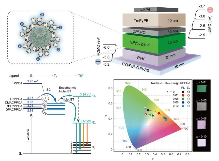面对这一制约稀土材料迈向高端应用的瓶颈,研究团队开创性地提出有机半导体敏化策略,以功能化有机配体作为“光电桥梁”,成功将能量精准高效地传递给绝缘稀土纳米晶,实现了电流驱动下的高效发光。
