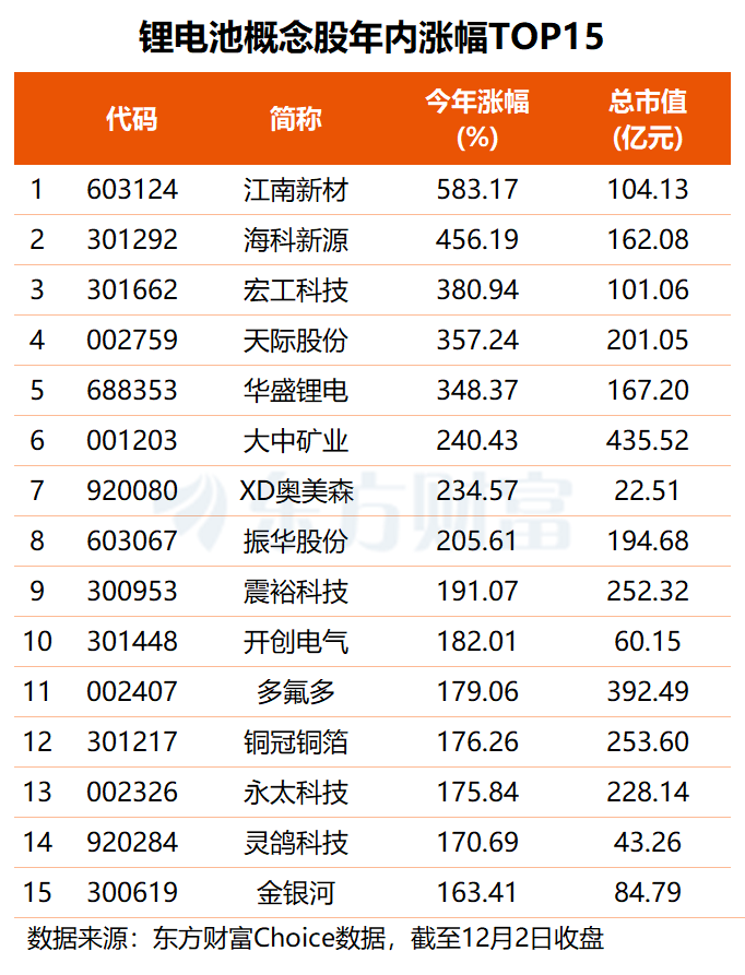 约九成锂电池概念股年内股价实现上涨,平均涨幅约50.61%。其中,江南新材年内大涨583.17%,海科新源累涨4.5倍,宏工科技、多氟多、石大胜华、中材科技等46股区间涨幅均在100%-400%之间。