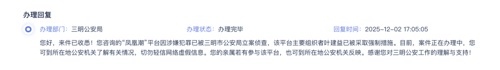 12月2日,福建省三明市公安局通过政务平台发布回应,明确指出:“凤凰潮”平台因涉嫌犯罪已被立案侦查,该平台主要组织者叶建益已被采取强制措施。目前,案件正在办理中。