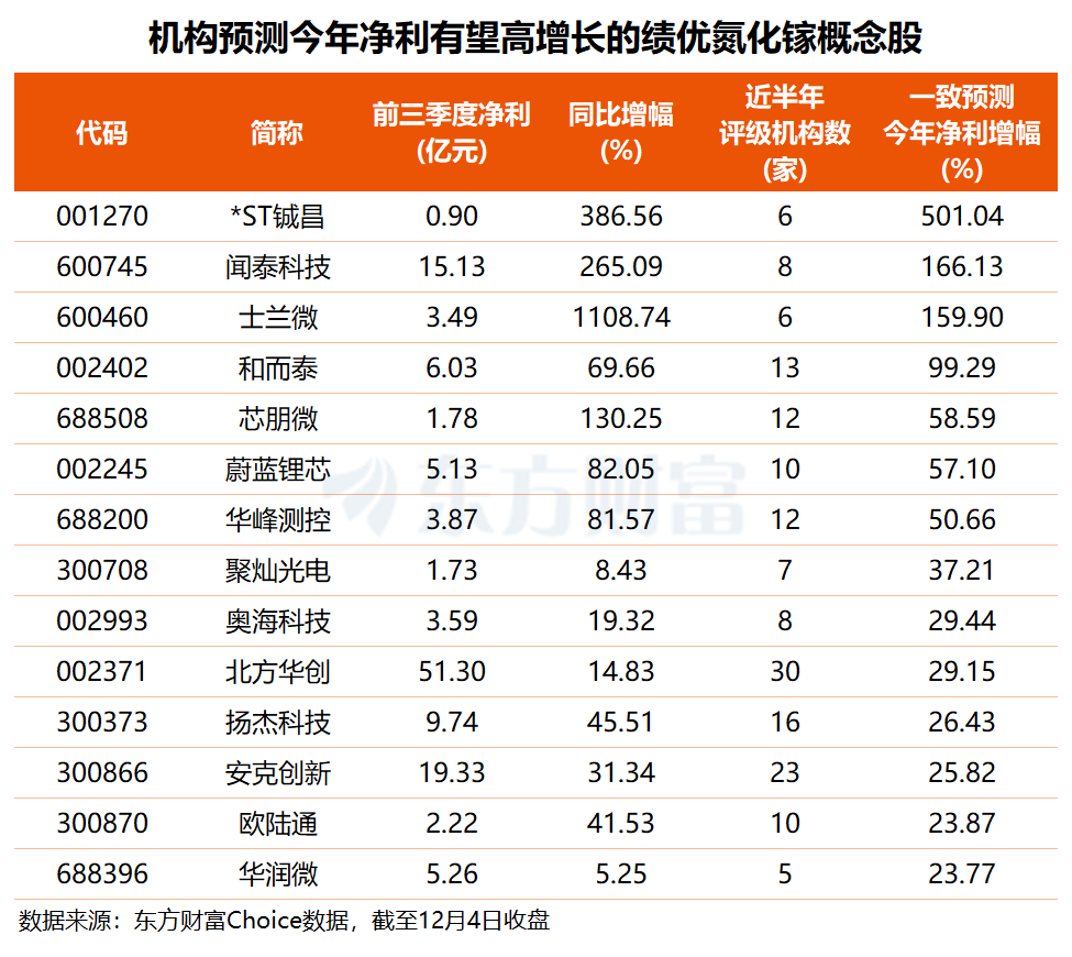 四分之三的氮化镓概念股年内股价实现上涨,平均涨幅约31.44%。其中,和而泰、赛微电子、中恒电气、海陆重工、乾照光电5股年内股价翻倍,欧陆通、华峰测控、京泉华等7股区间涨幅均超50%。