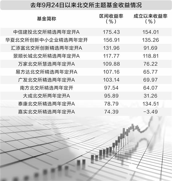 从去年9月24日至今,11只北交所主题基金均有完整运作过程,业绩分化明显。具体看,11只基金中有7只在该区间获得了超100%的收益率,最高为中信建投北交所精选两年定开A,收益率为175.43%;其次是华夏北交所创新中小企业精选两年定开,收益率超过了150%;另外有3只基金收益率不足100%,最低收益率在75%左右,和最高收益率基金之间相差超100个百分点。