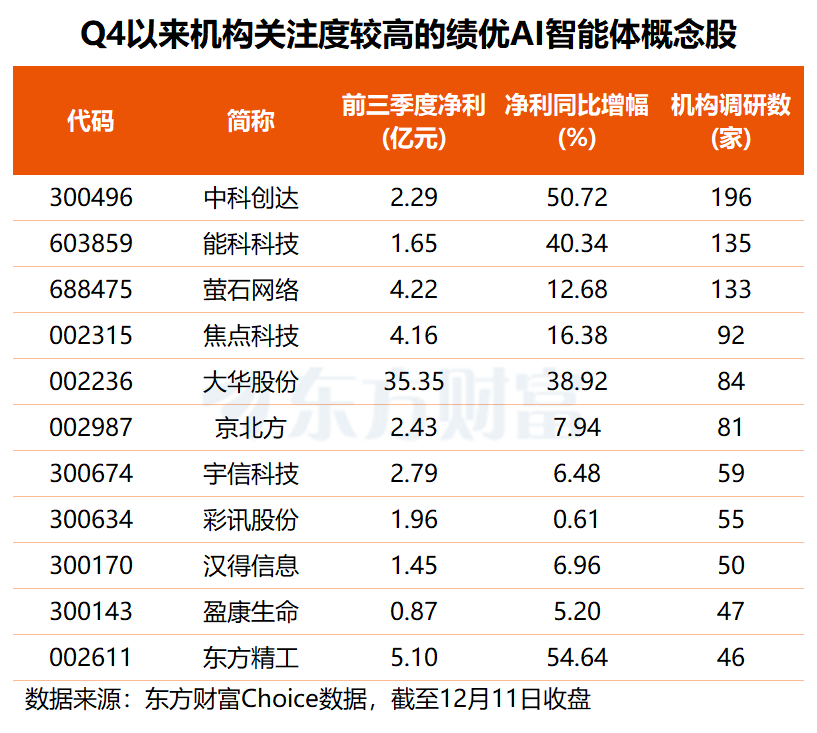 东方财富Choice数据显示,四季度以来,上述54只业绩增长的AI智能体概念股中,有19股获得机构关注。其中,中科创达获近200家机构集中调研,能科科技、萤石网络机构调研数均超130家,焦点科技、大华股份、京北方的机构调研数均在80家至100家之间,宇信科技、彩讯股份、汉得信息也有超50家机构前往调研。