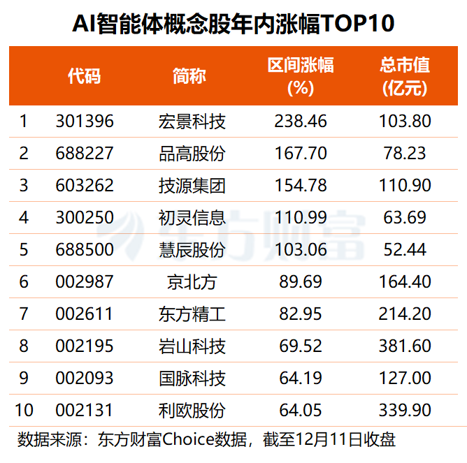 尽管AI智能体板块近期有所回调,但近八成概念股都实现了年内股价的上涨,平均涨幅约24.16%。其中,股价翻倍的有5股,宏景科技今年以来股价涨超2倍,品高股份、技源集团、初灵信息、慧辰股份区间涨幅均在100%至170%之间。