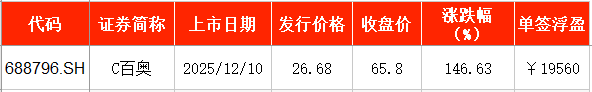 12月10日,百奥赛图在上交所挂牌上市,发行价为26.68元/股,截至上市首日收盘,该股报65.8元/股,涨幅为146.63%。以收盘价计算,投资者中一签浮盈为1.96万元。