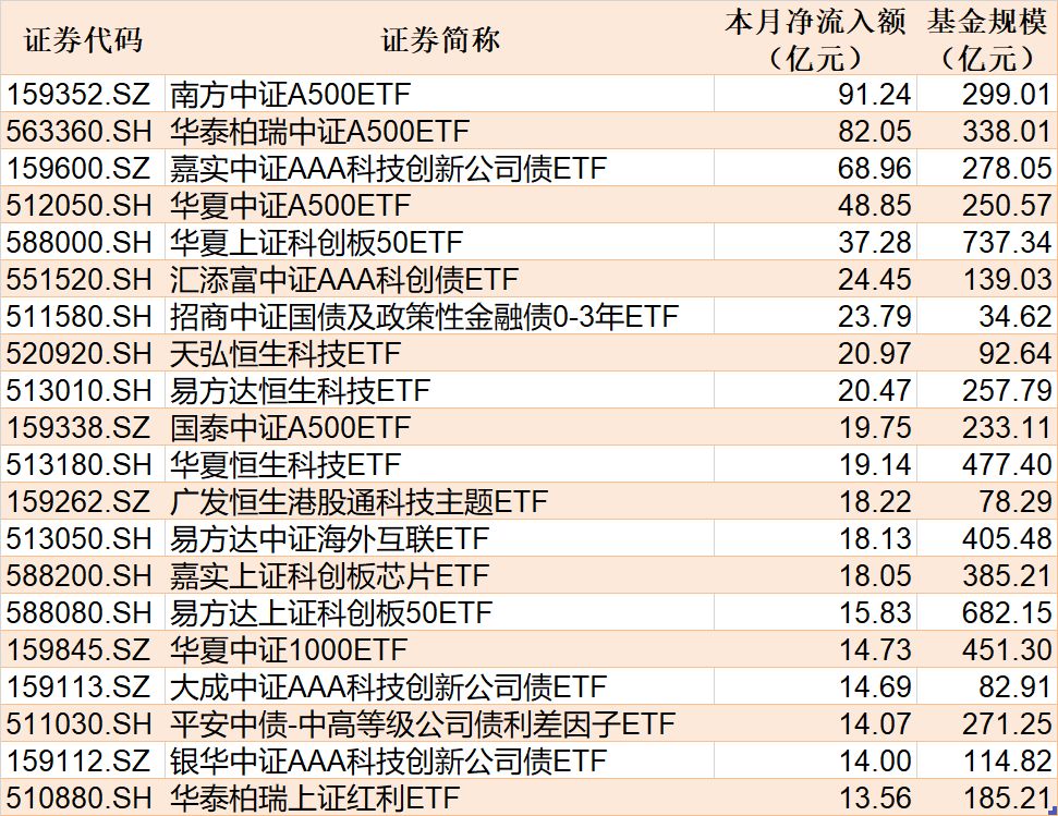 与此同时,海富通中证短融ETF基金份额减少0.11亿份,净流出额为12.07亿元;华夏上证50ETF份额减少3.35亿份,净流出额为10.38亿元;汇添富中证800ETF份额减少3.66亿份,净流出额为4.41亿元。