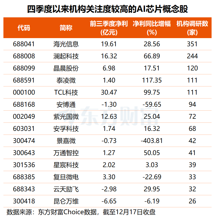 作为硬科技的代表之一,AI芯片概念股们普遍受到机构关注,东方财富Choice数据显示,今年四季度以来,共有14股获得超20家机构集中调研。其中,海光信息机构关注度最高,有351家机构前往调研;澜起科技位居次席,共获244家机构调研;晶晨股份、泰凌微、TCL科技的机构调研数均在百家以上。