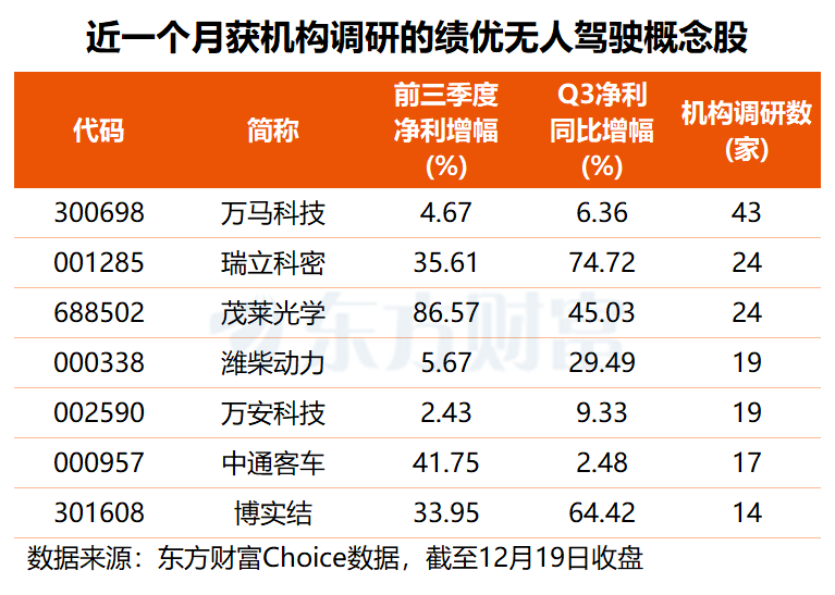 上述109只绩优无人驾驶概念股中,近一个月共有7股获得超10家机构调研。其中,万马科技颇受机构青睐,共43家机构前往调研,瑞立科密、茂莱光学的机构调研数均为24家,潍柴动力、万安科技、中通客车分别获19家、19家和17家机构调研。