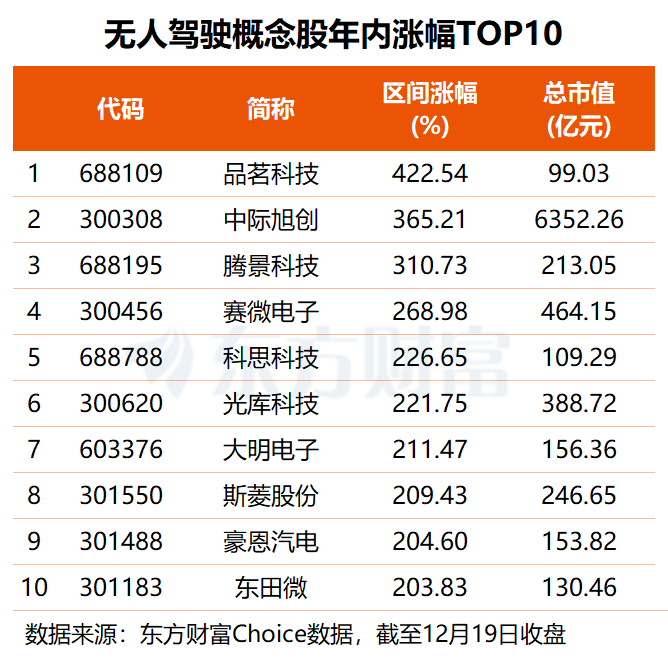 无人驾驶板块指数年内涨约四成,其中204股实现股价上涨,占比近八成,更有29股股价涨超1倍。品茗科技涨幅居首,公司股价年内涨超4倍;中际旭创、腾景科技分列二三位,年内涨幅分别为365.21%和310.73%;赛微电子、豪恩汽电、东田微等7股的区间涨幅均在两倍以上。
