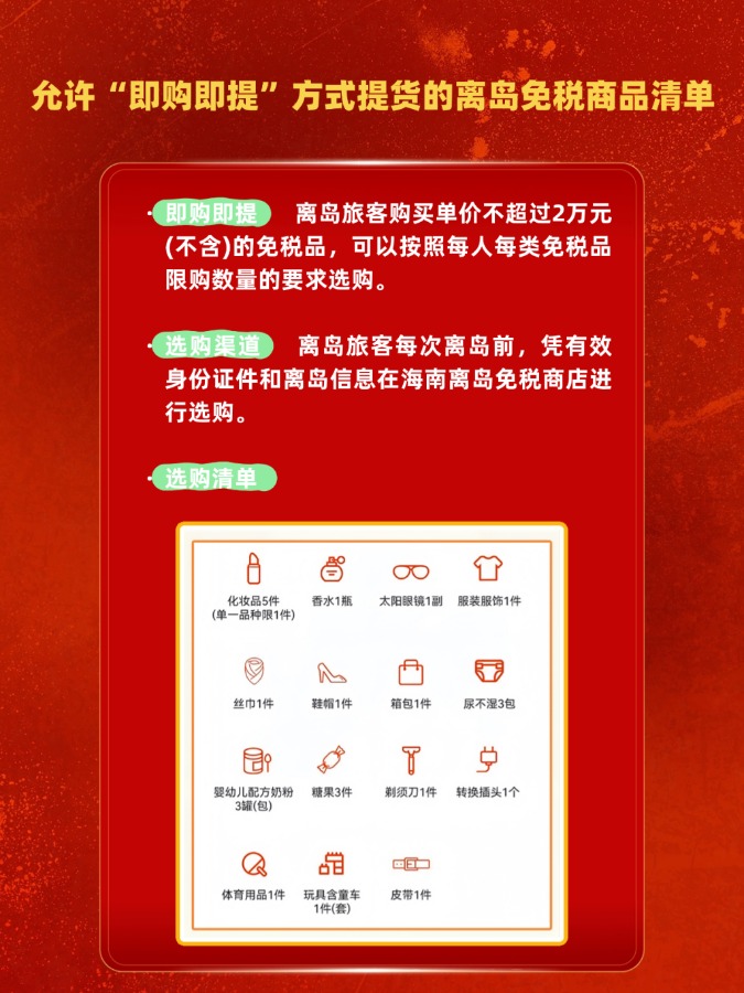 与此同时一个自然年度内有离岛记录(2025年11月1日起)的岛内居民,在本自然年度内可不限次数购买“即购即提”提货方式下的15类单价不超过2万元(不含)的免税商品,年度购物额度不超过10万元。
