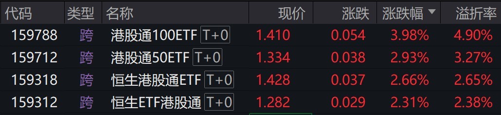 多只港股相关ETF早盘大幅上涨,港股通100ETF涨约4%,港股通50ETF涨约3%,但溢价均超3%。