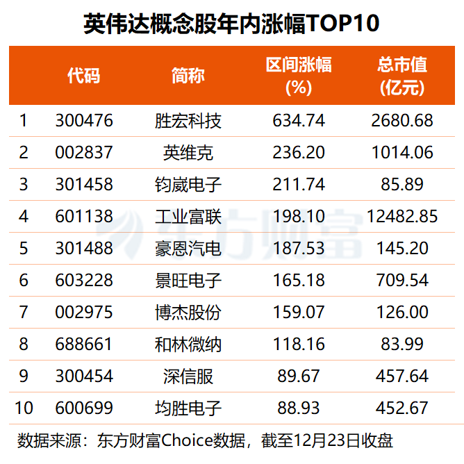 英伟达概念板块指数今年累涨近50%,其中八成概念股股价实现上涨,胜宏科技股价涨超6倍居首,英维克、钧崴电子均涨逾2倍,工业富联、景旺电子等5股区间涨幅均在100%至200%之间。