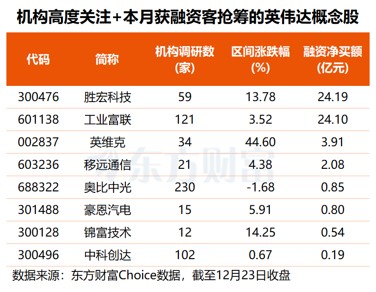 值得一提的是,上述17只机构高度关注的英伟达概念股中,有4股本月获融资客大举抢筹,其中,胜宏科技、工业富联融资净买额均超24亿元,英维克获杠杆资金加仓3.91亿元,移远通信也获融资净买入2.08亿元,奥比中光、豪恩汽电、锦富技术的融资净买额均在5000万至1亿元之间。