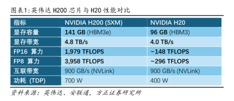 H200芯片较此前特供中国的H20芯片有较大性能提升,其FP16算力高达1979T、H20为148T;FP8算力达3958T,H20为296T。