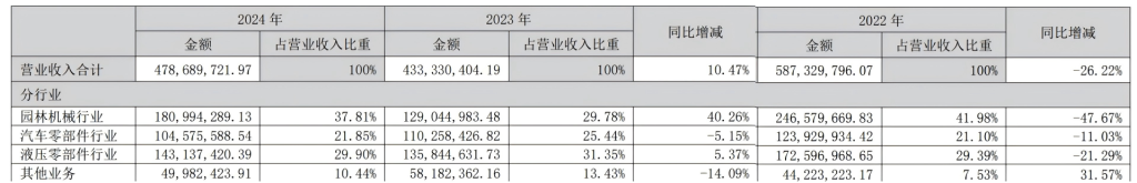 根据锋龙股份此前年报,公司2023年实现营收4.33亿元,同比减少26.22%,净利润-704万元,同比减少114.49%;2024年实现营收4.78亿元,同比增长10.47%,净利润459.3万元,同比增长165.24%,锋龙股份表示主要系公司园林机械板块业务复苏,同时公司加强成本费用管控,持续深化降本增效,提高生产经营效率,实现扭亏为盈。