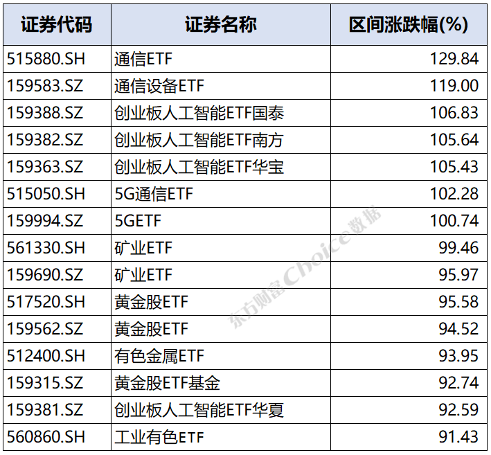 根据2025年截至12月24日的全年数据,ETF市场涨幅排行榜清晰勾勒出贯穿全年的两条核心投资主线:以人工智能和通信为代表的科技革命,以及以战略性资源和黄金股为代表的实物资产重估。