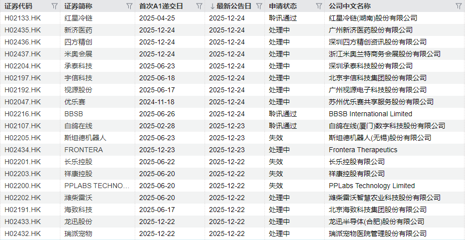 其中,广州新济医药股份有限公司、深圳四方精创资讯股份有限公司、浙江米奥兰特商务会展股份有限公司、Frontera Therapeutics、龙迅半导体(合肥)股份有限公司、瑞派宠物医院管理股份有限公司等6家公司为首次递交。