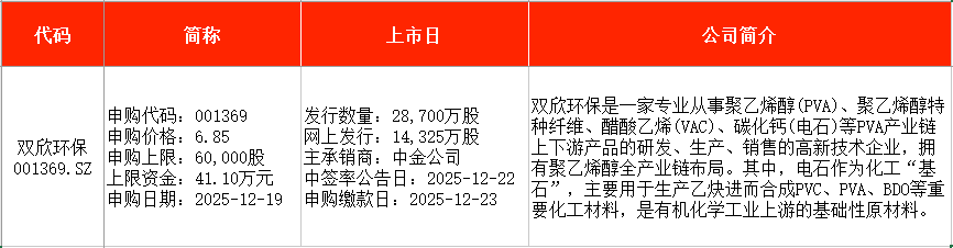从时间表看,誉帆科技(001396)、强一股份(688809)、双欣环保(001369)等均将在本周二(12月30日)上市;蘅东光(920045)将在本周三(12月31日)上市。