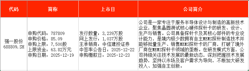 Wind资料显示,强一股份是一家专注于服务半导体设计与制造的高新技术企业,聚焦晶圆测试核心硬件探针卡的研发、设计、生产与销售。公司具备探针卡及其核心部件的专业设计能力,是境内极少数拥有自主MEMS探针制造技术并能够批量生产、销售MEMS探针卡的厂商,打破了境外厂商在MEMS探针卡领域的垄断。