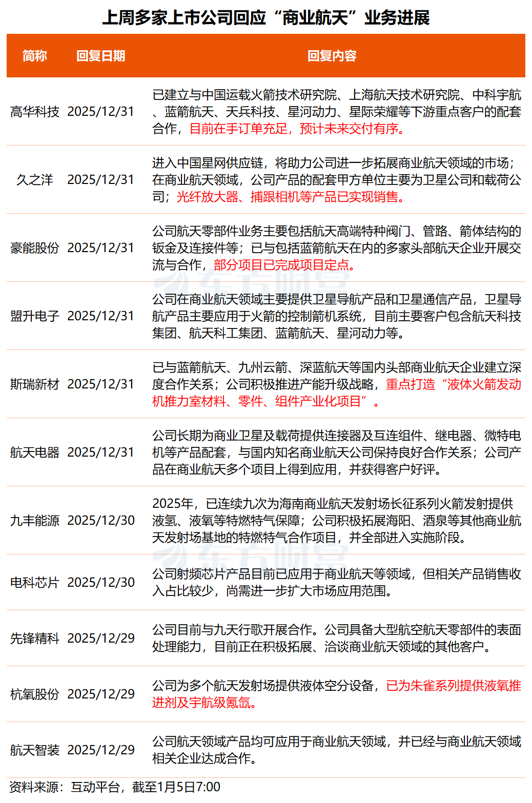 据东方财富不完全统计,上周有多家上市公司在互动平台对商业航天相关提问进行了回复: