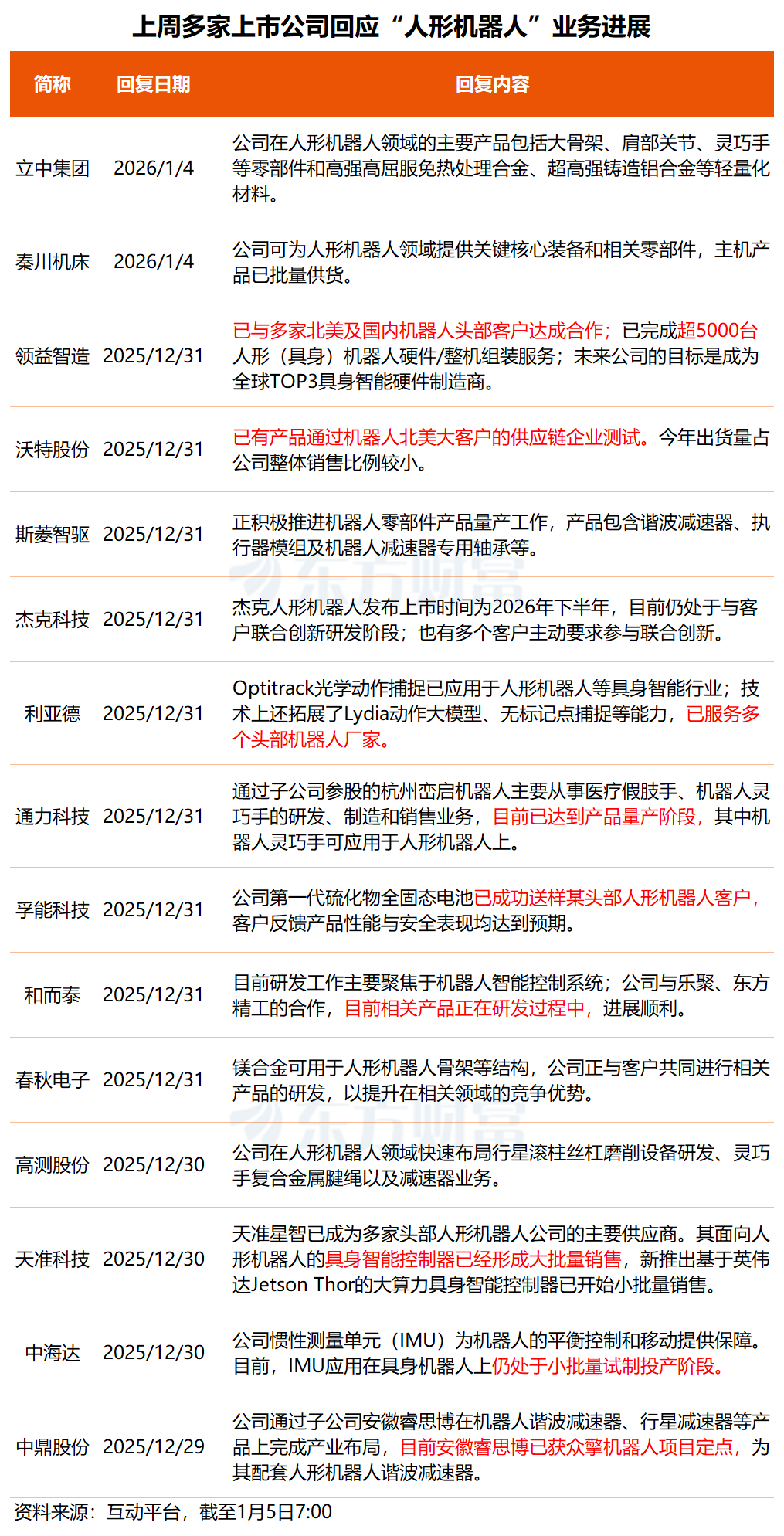 据东方财富不完全统计,上周有多家上市公司在互动平台对人形机器人相关提问进行了回复:
