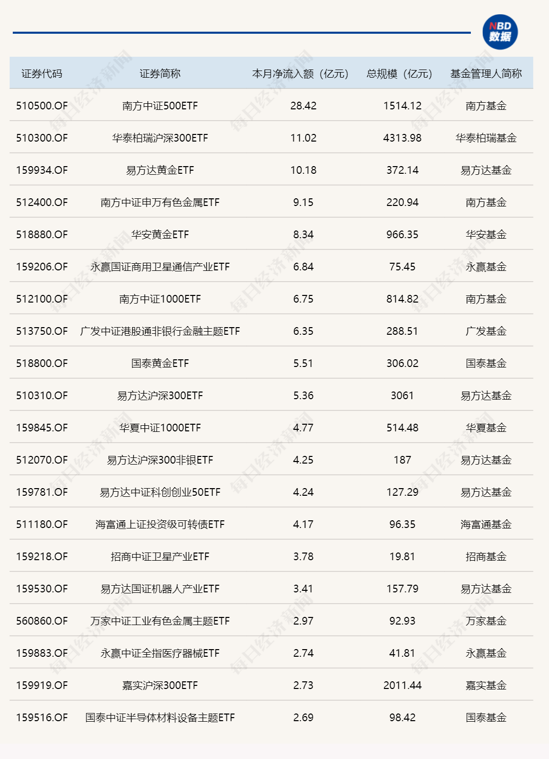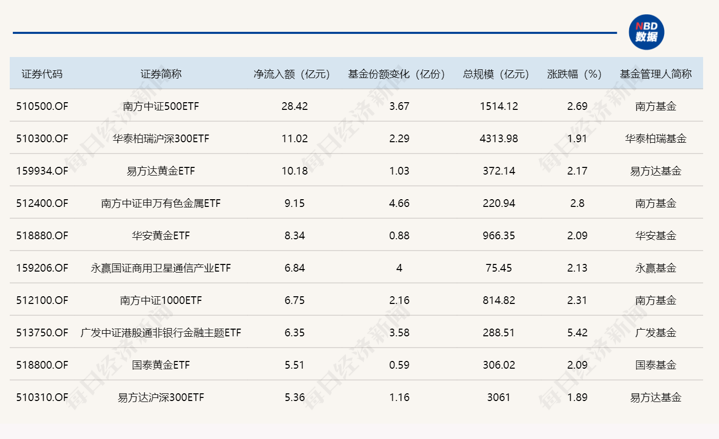 Wind数据显示,在1月5日的非货币ETF市场中,南方中证500ETF份额增加3.67亿份,净流入额28.42亿元;华泰柏瑞沪深300ETF份额增加2.29亿份,净流入额11.02亿元;易方达黄金ETF份额增加1.03亿份,净流入额10.18亿元。