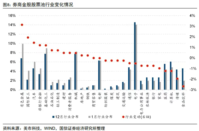 开源证券研报数据指出,从相对变化来看,券商1月金股在有色金属、基础化工、建筑材料等行业的增配较多,分别增加了2.7%、2.1%、1.3%。