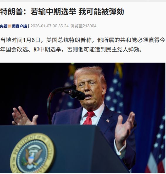 据央视新闻,当地时间1月6日,美国总统特朗普称,他所属的共和党必须赢得今年国会改选、即中期选举,否则他可能遭到民主党人弹劾。