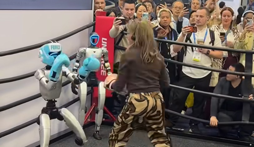 在CES现场,国外观众与宇树机器人互动“格斗”。