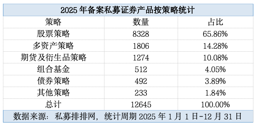 分策略来看,股票策略依然是私募发行市场“主力军”。据统计,2025年新备案股票策略私募基金8328只,占全部备案产品的65.86%,占据绝对主导地位。多资产策略、期货及衍生品策略私募基金分别以1806只和1274只的新备案数量位列第二和第三,占比分别为14.28%和10.08%。而债券策略和组合基金2025年新备案数量仅为492只和512只,占比分别为3.89%和4.05%,