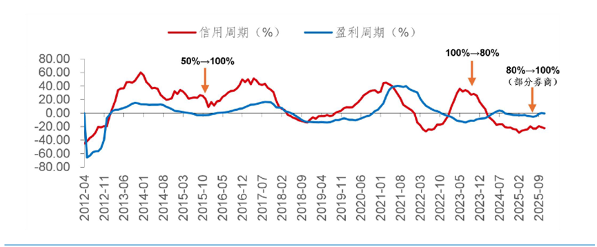 2015年,中国经济处于信用周期和盈利周期双下行,难以对股市高估值形成有力支撑,A股挤压估值泡沫,市场进入熊市。2023年,受地产等行业景气度下滑影响,社会信用融资增速回落,上市公司盈利增速较低,下调融资保证金比例并未扭转市场颓势。2025年,上市公司盈利触底回升,信用周期开始低位修复,对市场形成有力支撑,上调融资保证金比例也未阻止市场上涨。